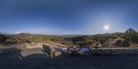 Panoramic view from a scenic hilltop in Los Angeles, California. Benches provide an elevated vantage point overlooking the majestic mountains and a full moon. A serene and captivating evening in the city of angels.