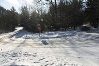 This stunning landscape photo was taken in Canada. The image features a beautiful mix of asphalt road, lush forest, and green grass. The road leads through the forest, with sunlight filtering through the tree branches. There is a layer of snow covering the ground, accentuating the wintry atmosphere. The sky is dotted with fluffy clouds, creating a picturesque scene. In the distance, you can see the city of Toronto, with street lights shining under the clear, sunny sky.