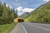 This stunning photo captures a low asphalt road winding through the majestic mountains and lush forests of British Columbia, Canada. The road surface, surrounded by vibrant vegetation and towering trees, cuts through the highlands, offering a day of adventure and connection with nature. The scenic view showcases the diverse landscape of British Columbia, showcasing sloping hills, cloud-filled skies, and pristine land lots. The image also showcases the well-designed infrastructure of the region, including a tunnel on the thoroughfare. Explore the beauty and tranquility of Canada's British Columbia with this captivating image.