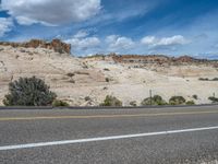 A scenic view of a rural road in Head of the Rocks, Utah. The asphalt road cuts through the landscape, surrounded by breathtaking natural beauty. Clear blue skies and fluffy clouds complete the idyllic scene.