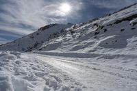 A stunning image of a low landscape asphalt mountain road in Italy is captured during the day. The road curves through the mountain landforms as snow covers its surface. The snow glistens under the sunlight, creating a beautiful atmosphere. The untouched nature and off-road track give a sense of adventure in the highlands. The blue sky with scattered clouds adds a touch of serenity to the freezing and glacial surroundings. This stock photo portrays the beauty of Italy's mountainous terrain and showcases the captivating mix of nature and man-made infrastructure.