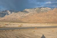 a man riding a bike on a paved road past mountains, clouds and a mountain range