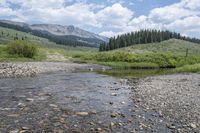 This stock photo showcases a stunning mountain river in Colorado, USA. The crystal-clear water flows through a picturesque landscape, surrounded by mountains, lush forests, and open spaces. The riverbank is adorned with grass, rocks, and dirt, adding to the natural beauty. The image captures the serenity and tranquility of nature, with a blue sky dotted with fluffy white clouds overhead. It is the perfect representation of the rugged and scenic wilderness found in Colorado's highlands. Whether you're seeking images of nature, off-road tracks, or water resources, this photo is sure to meet your needs.