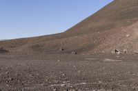 A rugged desert landscape in California, USA. The open space is filled with sandy hills, rocky mountains, and gravel surfaces. Clear skies reveal the natural beauty of this geological wonder.