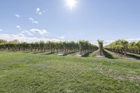 This beautiful stock photo captures the breathtaking open space in rural Ontario, Canada. The image showcases a vast green field with lush grass surface under a clear and sunny sky. The sun is visible on the horizon, spreading its warm sunlight across the picturesque landscape. This idyllic setting is perfect for representing the scenic beauty of Ontario's countryside. The image can be used to symbolize agriculture, farming, and vineyards in the region.