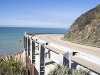 A scenic view of the Pacific Coast Highway in California. The road winds along the coastal headlands, with the clear sky reflecting in the ocean waves. The concrete bridge with Armco barrier adds to the architectural beauty of the landscape.