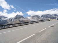 This stock photo showcases a picturesque road in Austria, surrounded by breathtaking mountain views and a clear sky. The asphalt road stretches through the stunning European landscape, leading towards untouched nature. The road is protected by Armco barriers, ensuring safety for drivers. The image captures a serene day scene, where the road and guard rail blend harmoniously with the majestic mountains in the background.