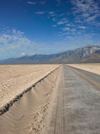 This stunning photograph captures a scenic road winding through the rugged mountains of California. The asphalt road surface contrasts with the surrounding natural landscape, as mountains and desert stretch into the horizon. A clear blue sky with fluffy clouds adds to the picturesque scene. The off-road track adds an adventurous touch to the image, giving a sense of exploration and nature. The combination of gravel and dirt road adds to the rugged charm of the scenery. This captivating photo perfectly encapsulates the beauty of the California landscape and the allure of an open road journey in the USA.