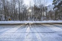 A scenic landscape in Ontario, Canada. The asphalt road winds through a snowy forest, illuminated by sunlight. The trees and vegetation create a beautiful natural backdrop against the clear blue sky.