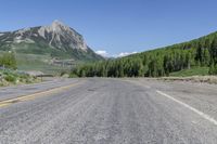 This is a landscape image taken on Slate River Road in Crested Butte, Colorado, USA. The photo shows an asphalt road surrounded by grass, vegetation, and forest. In the distance, there are mountains and a clear sky. The straight road leads to a mountain resort, as indicated by the sign that says 'Rocky Mountain'. This image captures the natural beauty of the highlands, with the road serving as an infrastructure for travelers and adventurers. It is a perfect representation of the serene and breathtaking nature found in Colorado.