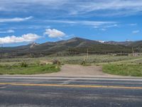 A scenic view of a rural road in Colorado, USA. The road winds through the beautiful mountain landscape, with clear blue skies and fluffy white clouds. A perfect day to enjoy nature's beauty.
