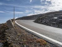 a paved road with a large curve and two street posts, against the backdrop of a mountainous hill