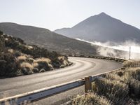This captivating stock photo showcases a picturesque curve in the middle of a road, set against the breathtaking backdrop of the Tenerife landscape in Spain. The asphalt road winds its way through the highlands and hills, surrounded by majestic mountains and a clear sky. In the distance, steam rises from the mountains, adding a touch of mystery to the scene. This image captures the beauty of nature and the allure of the European wilderness. Perfect for illustrating concepts such as infrastructure, highways, and mountain landforms.
