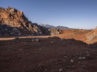This stock photo shows a captivating landscape with a red dirt road leading towards a majestic desert mountain. In the background, there are other rocky mountains, creating an open space that resembles the rugged beauty of Mars-like terrain. The clear sky and the untouched wilderness add to the natural charm of this scene, evoking a feeling of serenity and adventure. This picturesque location is located in Shangri-La, Yunnan province, Asia, making it a unique and mesmerizing destination for off-road enthusiasts and nature lovers alike.