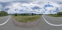 A scenic road trip through the highlands of Colorado, surrounded by majestic mountains and lush forests. The straight road cuts through the wild wilderness, with yellow grass lining the asphalt. A perfect day for exploring nature's beauty.