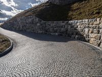 This stock photo features a picturesque road with stone blocks that leads up to a hill next to a lush green grass hill. The stunning landscape showcases the beautiful architecture of the asphalt road as it curves through the terrain. The clear sky and visible sun provide ample sunshine, creating a serene and tranquil atmosphere. The road surface is well-maintained with a guard rail and Armco barrier ensuring safety. The surrounding vegetation enhances the natural beauty of the mountain slope. This captivating image showcases the stunning countryside of Austria in Europe.