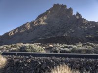This stock photo features a picturesque road in Spain on a sunny day. The asphalt road meanders through a breathtaking mountain landscape filled with lush trees and rugged highlands. The hills and mountain landforms create a stunning backdrop along with the rocky cliffs and profile of the mountain range. The rural and wilderness setting adds to the serenity of the scene. The clear sky overhead highlights the natural beauty of the area. This image captures the essence of Spain's geology and transport infrastructure, and is a depiction of the wild and mountainous region of Tenerife in Europe.