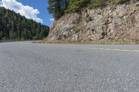 A scenic landscape in Colorado, USA. The road winds through the mountains, with a steep cliff in the distance. The clear day offers a picturesque view of nature and the towering rock wall.