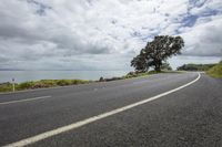 This stock photo features a picturesque view of an asphalt road winding through a serene landscape. On one side of the road, there is a beautiful tree, adding to the natural ambiance. The road runs along the coast, with water visible in the background. The surrounding hills and grassy land lots create a peaceful and inviting atmosphere. The cloudy skies and scattered cumulus clouds add drama to the scene, while the horizon blends seamlessly with the ocean. The road surface is smooth and well-maintained, perfect for recreational activities. Vegetation can be seen on both sides of the road, enhancing the overall greenery of the area. It's a perfect representation of a day spent in nature, enjoying the beauty of the surroundings.