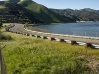 This stunning stock photo captures a person standing by the edge of a highway in California, USA. With a bike helmet and poles in hand, the adventurous spirit is palpable. The coastal landscape unfolds in the backdrop, with the glistening water of the ocean making an appearance. The road stretches ahead, curving gracefully through the highland mountains and lush forests. The clear sky and green surroundings create a serene atmosphere. The guard rail and elevated bridge blend seamlessly into the nature-filled scenery. It's the perfect image to depict a scenic road trip adventure in California.