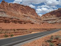 A scenic view of Highway 12 in Capitol Reef, Utah. The road winds through the beautiful landscape, with clear skies and fluffy clouds. Nature's beauty and the open road await in this quarter of the USA.