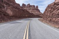 This stunning stock photo captures a winding road in the mountains of Utah. The road stretches straight ahead, disappearing into the rugged desert landscape. Red rock formations surround the road, creating a breathtaking view. The brown asphalt contrasts against the vibrant red rocks, adding depth to the image. The day is gloomy with a grey sky, but the unique beauty of the landscape shines through. This photograph showcases the natural wonders of Utah, featuring the stunning mountain landforms and canyons. With Lake Powell in the distance, it's a perfect depiction of the picturesque scenery that the USA has to offer.