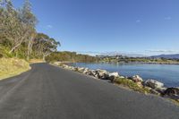 This stunning photo captures a scenic road surrounded by lush vegetation and a tranquil lake. The landscape features tall trees, clear blue water, and rocky shores. The road surface is smooth asphalt, making it ideal for driving or cycling. In the distance, fluffy clouds decorate the sky, adding to the serene atmosphere. This coastal location is perfect for a day of recreation and enjoying nature's beauty by the ocean.