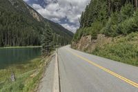 This beautiful stock photo captures a scenic road in Lillooet, British Columbia, Canada. The road is made of asphalt and runs alongside a large body of water, with trees and mountains on its sides. The landscape is breathtaking, with lush forests, highlands, and slopes. The image showcases the natural beauty of the area, with an abundance of vegetation and clouds in the sky. The photo was taken during the day, highlighting the vibrant colors of nature in this picturesque location.