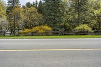 A scenic rural landscape in Ontario, Canada. The lush green grass and evergreen trees provide shade along the asphalt road. A charming fence with a pathway leads to a beautiful driveway. This peaceful scene captures the essence of nature in Ontario.