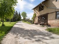 A picturesque dirt road winding through lush green fields and trees in the German countryside. The clear sky overhead adds to the serene beauty of this rural landscape. Along the road, there are some buildings, including a charming barn and a cozy home. The gravel path is perfect for leisurely walks and exploring the surrounding nature. Take a stroll on this peaceful road and immerse yourself in the tranquility of the European countryside.