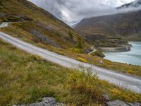 This stock photo features a breathtaking view of a winding trail surrounded by lush green grass and vegetation. In the background, a beautiful lake shimmers under the gloomy grey sky. The rugged terrain and mountain landforms add a sense of adventure and exploration to the scene. With its off-road track and gravel surface, this trail is perfect for nature enthusiasts seeking a highland adventure. The image captures the serene beauty of Austria, a picturesque country in Europe known for its stunning landscapes and water resources.