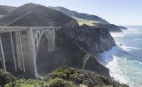 This stunning stock photo features a scenic view of the Big Sur region in California, USA. The image showcases a steep cliff overlooking the ocean, with breathtaking views of the coastal water and rocky headlands. The photo captures the beauty of nature and landscape, with a clear sky above and the rugged terrain of Big Sur. In the foreground, you can see a concrete street and Armco barrier, leading towards the iconic Bixby Creek Bridge on the Pacific Coast Highway. This image perfectly captures the essence of Big Sur's coastal beauty and is ideal for any project related to travel, nature, or California.