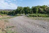 a road with rocks on it near a fence and trees in the background and a bench and a chair in the foreground