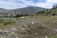 This stock photo presents a breathtaking view of Loveland Pass, located in the highlands of Colorado, USA. The image features a landscape with a small lake, known as Pass Lake, nestled on the side of a rugged mountain. In the distance, a snow-capped peak dominates the scene. The open space around the lake is covered in grass, with patches of vegetation and trees scattered along the slope. The cloudy sky adds depth to the alpine scenery. The dirt and gravel surface indicates an off-road track, perfect for nature enthusiasts seeking adventure. This stunning image captures the beauty and serenity of the Colorado highlands.