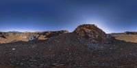 a scenic view of a rocky area, mountains and a river below a clear sky