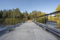This stunning stock photo captures a beautiful water landscape in Ontario, Canada. The photo showcases a picturesque view of an asphalt road surrounded by lush vegetation, tall trees, and a serene lake. The straight road leads the viewer's gaze straight ahead, with a bridge in the distance. The road surface is made of concrete and is lined with a wooden guard rail, fence, and Armco barrier. The photo conveys a peaceful and serene atmosphere, with fluffy clouds casting shadows over the landscape. This is an excellent image to convey the beauty of Ontario's natural surroundings, ideal for travel and nature-related projects.