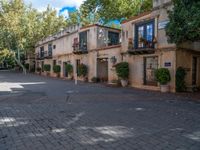 the paved courtyard is lined with potted plants and potted trees in a residential area