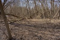 A serene autumn landscape in Ontario, Canada. The forest is filled with deciduous trees, their brown tints and shades creating a beautiful contrast against the clear sky. The open spaces are covered in a carpet of fallen leaves and undergrowth.
