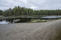 A serene lake in Ontario, with benches and trees lining the wooded area on either side. The gloomy grey sky casts a reflection on the calm water, creating a peaceful coastal landscape.