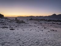 A serene dawn in Tenerife, Spain. The sun slowly rises over the mountains and rocks, casting a warm glow on the desert landscape. Clear skies and open spaces create a tranquil atmosphere.