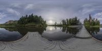 a wide fish - eye view of a river and land with trees surrounding it and a walkway along side the pond