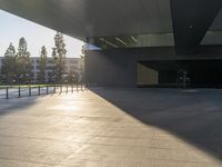 This stock photo captures a shadow of someone walking around an empty modern architecture building in a park. The building features a sleek design with concrete flooring and open spaces. The sunlight creates shadows and reflections on the floor, adding an artistic touch to the scene. The city skyline and clear sky can be seen in the background, emphasizing the urban setting. This image is perfect for illustrating concepts related to urban design, city life, business, and modern architecture.