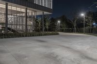 a large concrete slab in front of a glass building at night with lights on in the distance