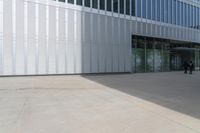 A modern office building in Shanghai's business district. The sleek grey metal walls contrast with the vibrant city life. Open space design and hard shadows create an urban atmosphere.