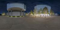 a wide angle of a street at night time with trees in the background, and a circular concrete building