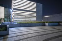 A modern office building in the business district of Shanghai, China. The sleek facade is illuminated by neon lights at night. The empty courtyard features planters and adds to the urban design of the city.