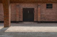 an empty brick walkway with a building in the background and two doors on either side
