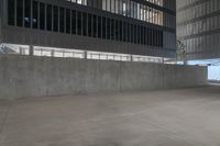 This is an image of a modern office building in the city of Shanghai, China. The architecture showcases a blend of modern and urban design elements with its concrete surfaces and artificial lighting. The composition captures the essence of city life, with the business district as the focal point. The grey walls and tiled floors create a contemporary aesthetic, while the parallel lines of the buildings add depth and interest to the composition. This photo represents the bustling business scene in Shanghai, as well as the unique architectural features of the city.