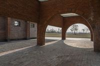 This is an image of a classic architecture in an art district in Shanghai, China. The brown brick buildings with concrete columns and arches create a unique urban design. The cobblestone walkway and brick wall add to the charm of the public space. The hard shadows on the floor and ceiling create an interesting contrast. The image represents the city life and industrial atmosphere of Shanghai. This photo captures the essence of the urban landscape and showcases the diverse architecture in China.