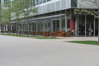 the exterior of a building with tables and benches set against glass walls, along the sidewalk